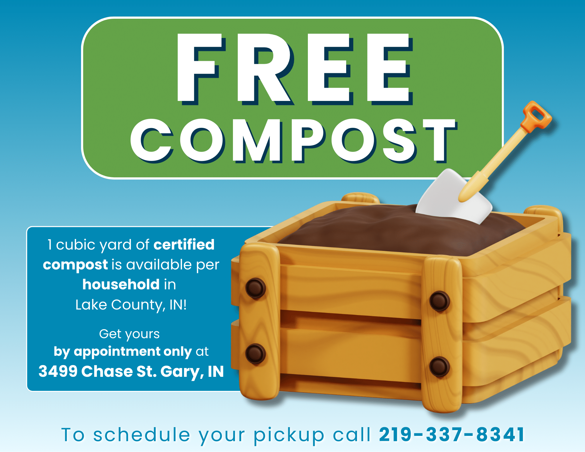 Compost is available by appointment only. Shovels are provided on site, but residents must be able to load and transport the compost themselves.